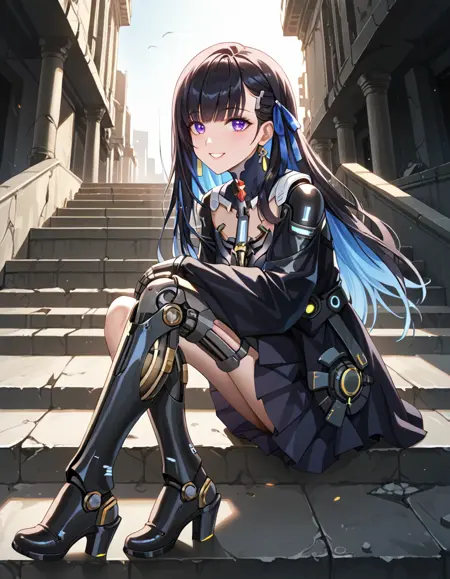 Tempest, long hair, tmp_dress, tmp_hair_ribbon, tmp_mechanical_arms, tmp_mechanical_leg, uneven legwear,tmp_boots tmp_earrings
