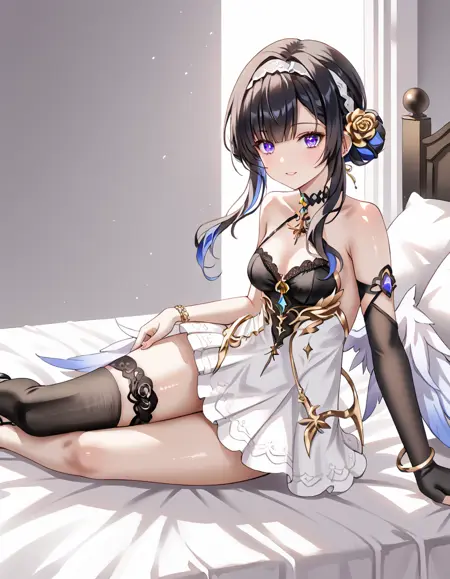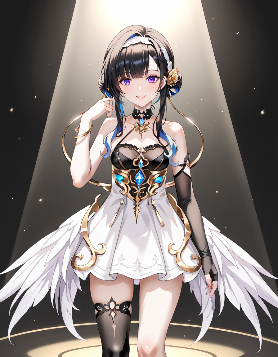 NightingaleAndRose, NnR_short dress, two tone dress, NnR_low_wings, fake wings, short hair with long locks, double buns, NnR_hairband, NnR_choker,(((single thighhigh, NnR_thighhigh, NnR_high_heels, NnR_bracelet, NnR_hair_ornament, NnR_elbow_glove, single glove, fingerless gloves