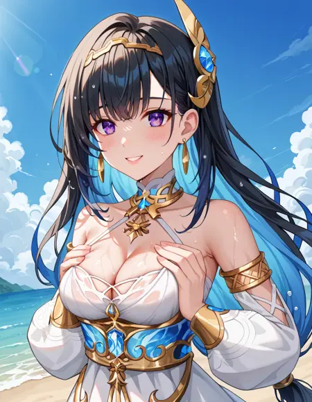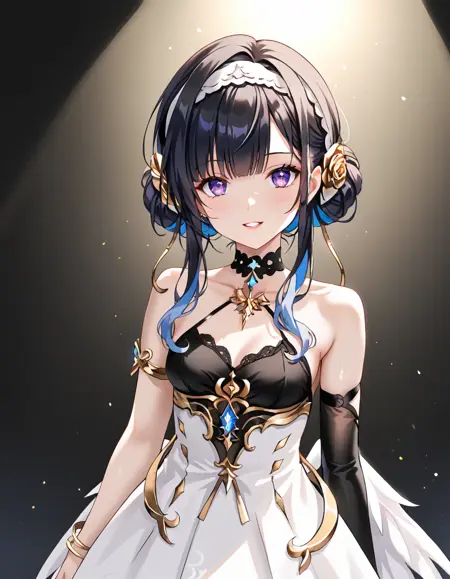 Selena, black hair, colored inner hair, blue hair, purple eyes, medium breast