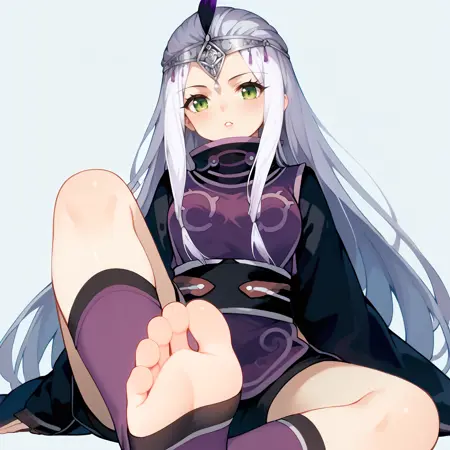 silver forehead ornament, purple vest, turtleneck, feathers on head, robe