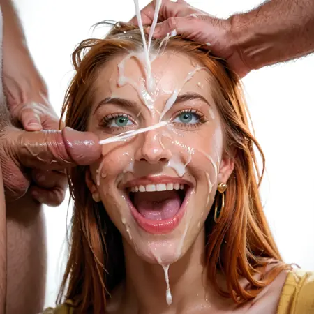 Positive : score_9, score_8_up, score_7_up, fclhge, 1girl, solo, kneeling, multiple boys, testicles, multiple male masturbation, grab head, penises, multiple cumming on her face, bukkake, multiple ejaculation, portrait, happy, smile, looking up, white background perfect eyes details,