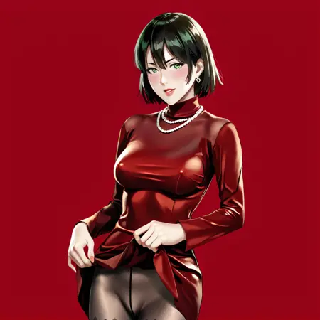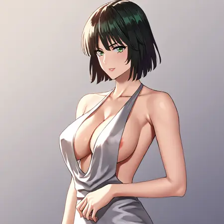 トリガー:Fubuki, 1girl, fubuki (one-punch man), green dress, black hair, short hair, large breasts, green eyes, bangs, long sleeves, necklace, jewelry, collarbone, collared dress, cowboy shot