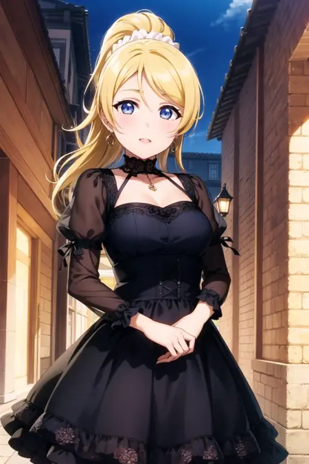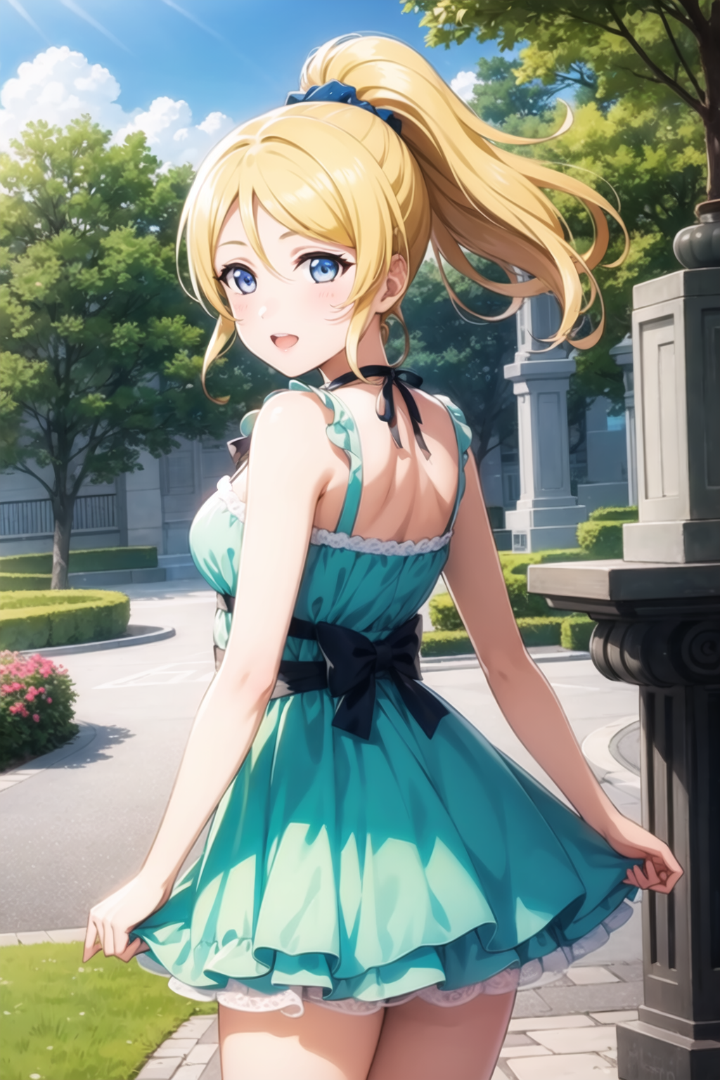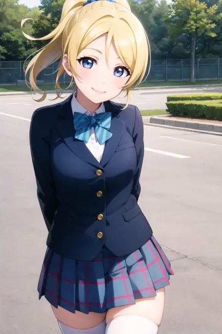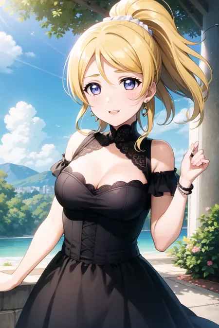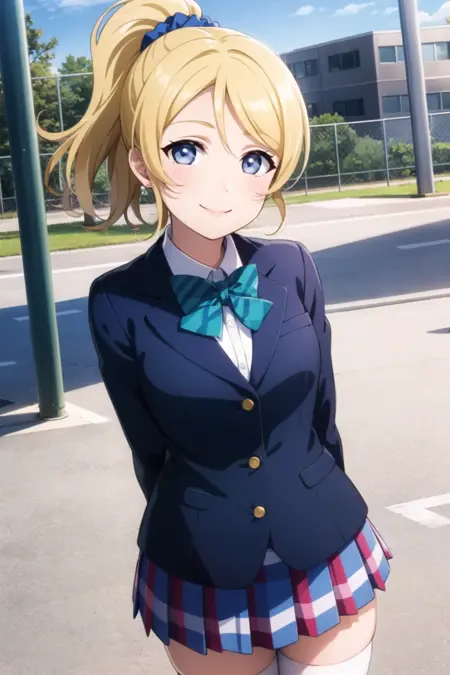 필요한 태그: 1girl, solo, ayase eli, blue eyes, ponytail, blonde hair, white scrunchie