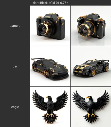 추가적으로 "matte black ceramic" 및 "contrasting golden metallic"와 같은 문구도 효과적입니다. 때로는 LoRA 없이도 매트한 검정과 금색 광택을 구현할 수 있습니다.