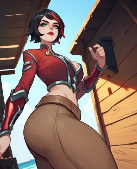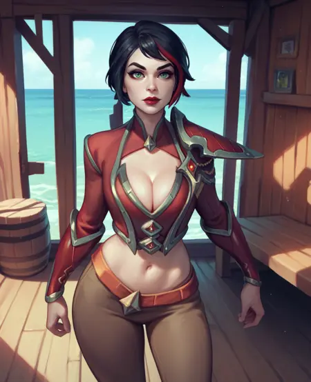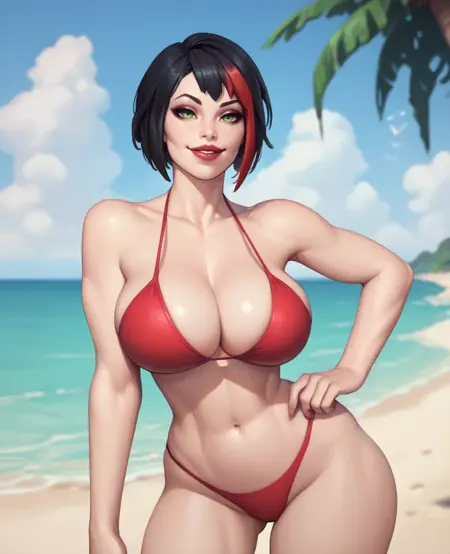 Vivian,绿色眼睛,黑色头发,带红色发缕,短发或中长发,
