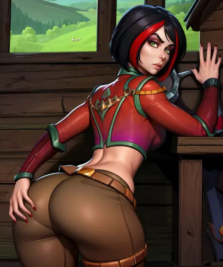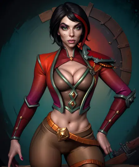 Vivian, green eyes, black hair, streaked red hair, - short or medium hair,