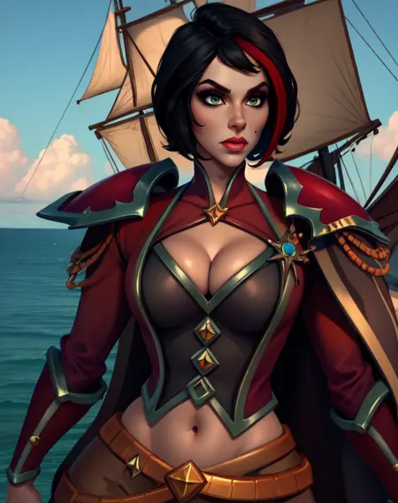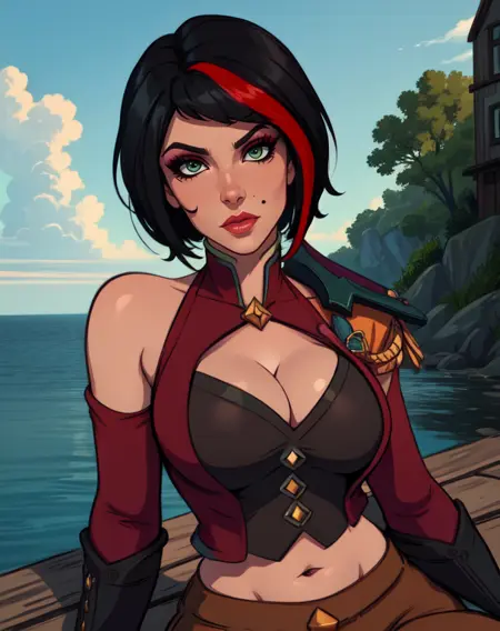 Vivian, green eyes, black hair, streaked red hair, - short or medium hair,