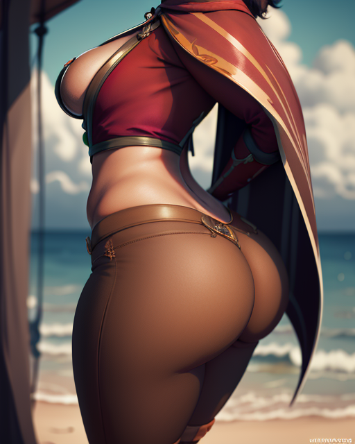 red top, long sleeves, red bracer, cleavage, - midriff, or navel, brown pants, belt, or gold belt,