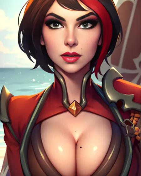 Vivian, green eyes, black hair, streaked red hair, - short or medium hair,