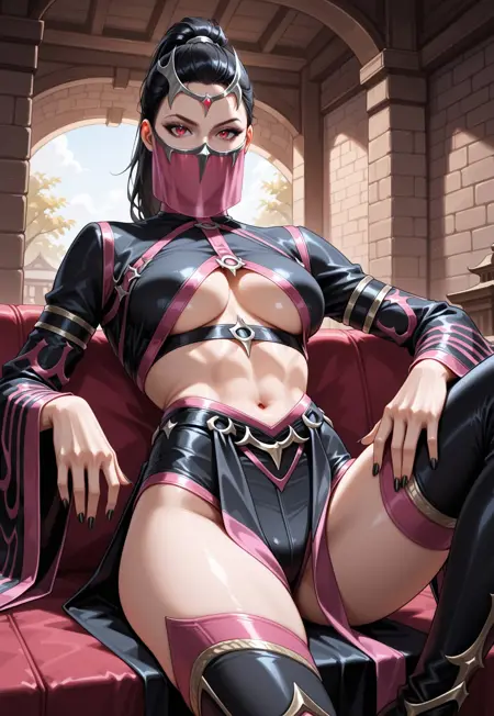 Mileena from Mortal Kombat 1 in her Deception costume. Didn't train her with her tarkat teeth, but I'm sure you can find a work around.
