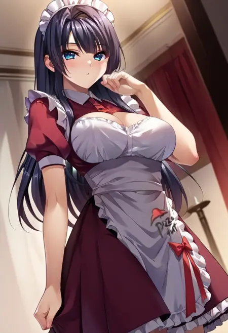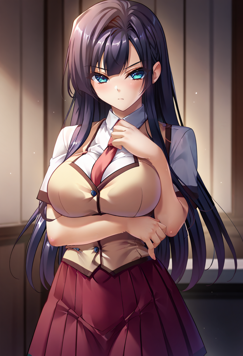 Default Outfit: "school uniform, red skirt, necktie, kneehighs, black socks, loafers"