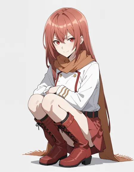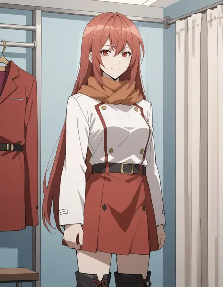 스카프, 긴 소매, 빨간 치마, 벨트, 허벅지 부츠