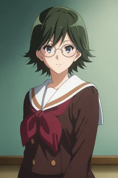 kamaya tsubame, short hair, green hair, blue eyes, glasses, school uniform, serafuku, brown uniform, white sailor collar, red neckerchief, long sleeves, white sleeves end, brown skirt, pleated skirt, white kneehighs, loafers