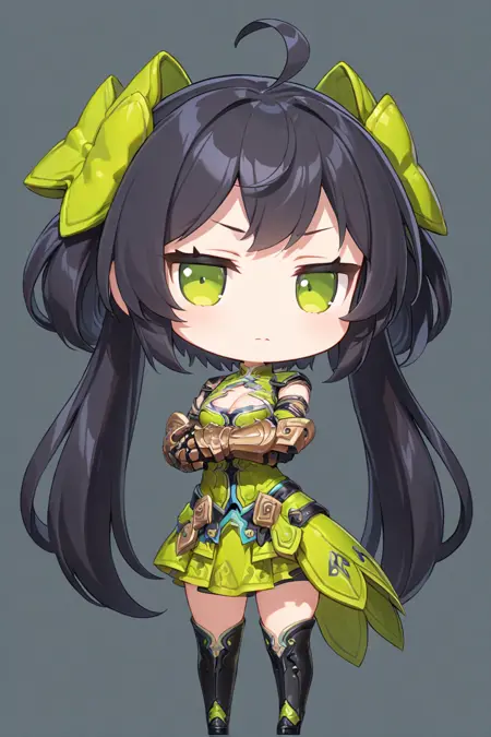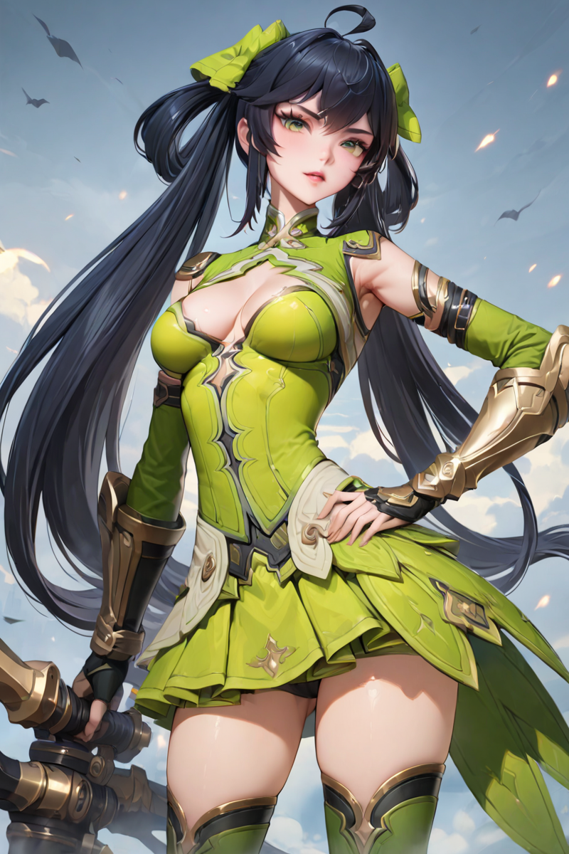 ,green eyes, black hair, ahoge, gauntlets, cleavage cutout, green skirt, <lora:Sunshangxiang_xl:0.8>