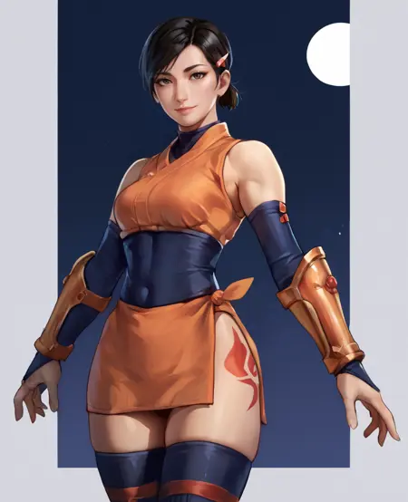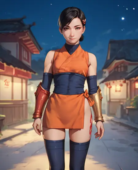 黑色过膝袜,无袖或露肩,短款橙色和服,肘部手套,青铜臂甲,凉鞋,---