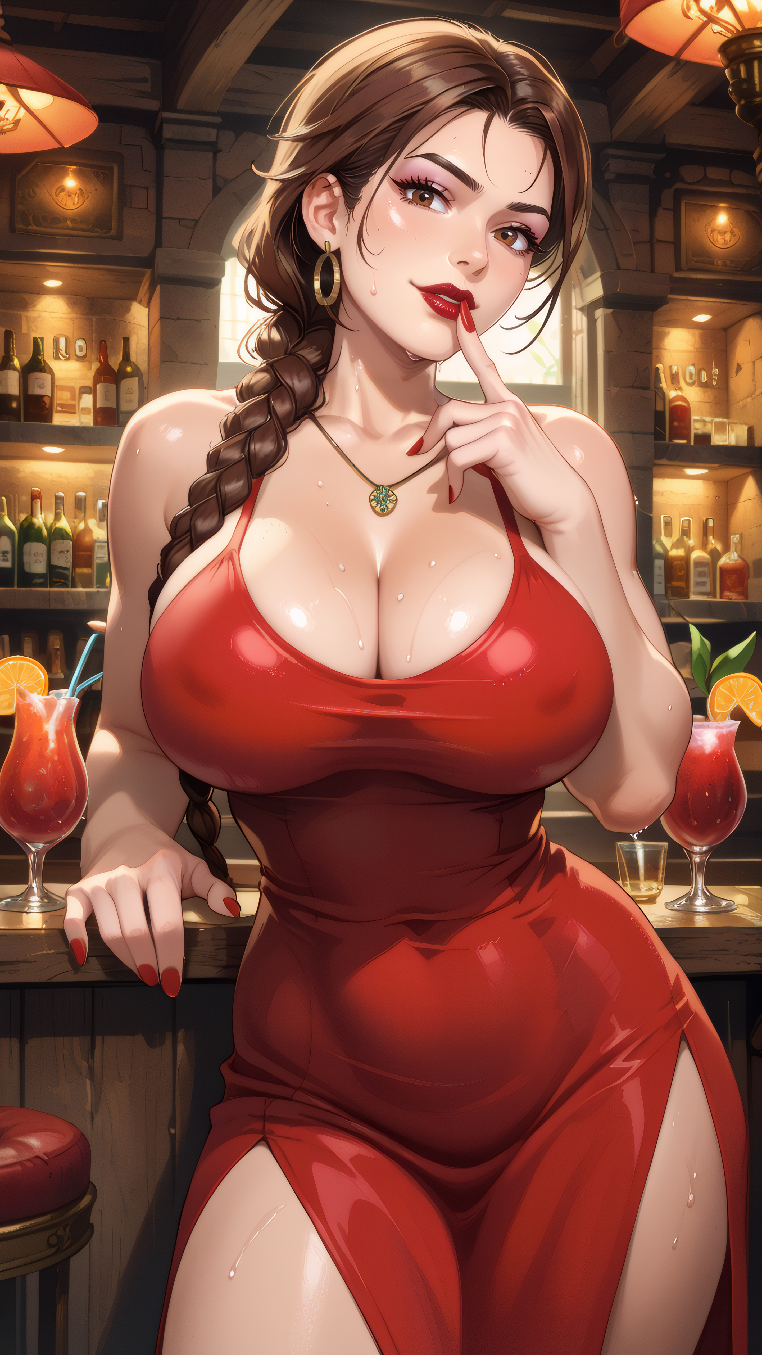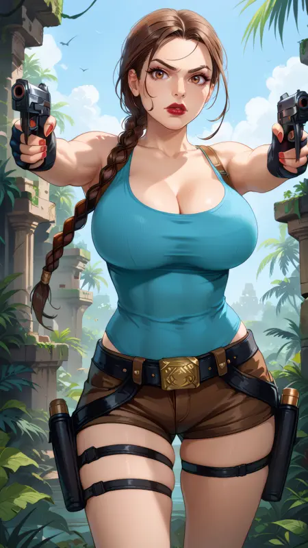 lara_classic, brown eyes, brown hair, braided ponytail, long braid, blue tank top, short shorts, fingerless gloves, black gloves, thigh strap, thigh holster, belt, red nails, cleavage, lips, makeup, red lipstick,