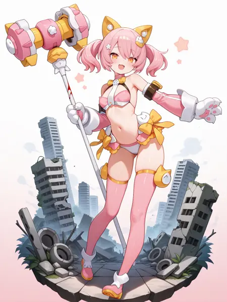タグ(衣装1): yellow bow skirt, pink thigh boots, pink detached sleeves, orange mechanical cat ears, pink bra, yellow thigh strap, cat necktie, cat hair ornament, white panties, star hair ornament, white mechanical paw gloves/pink gloves