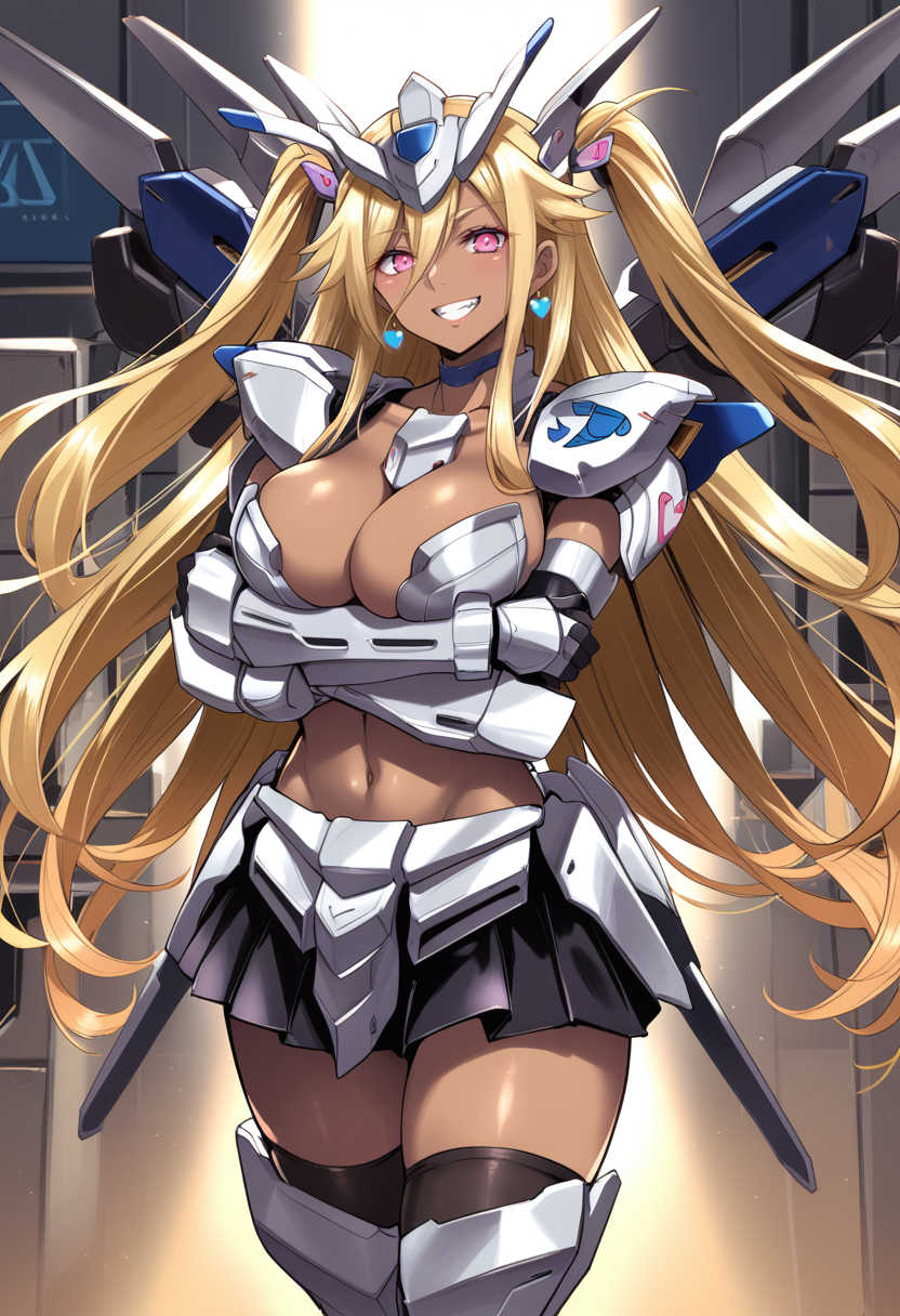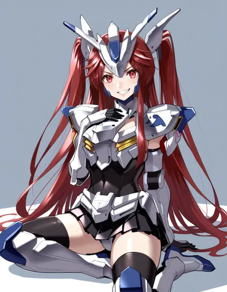 タグ(人化):メカムスメ、赤い目、人化、黒いスパッツ、装甲肘手袋、装甲スカート、装甲太ももブーツ、胸板、頭部装具、機械式頭部翼、両サイド上