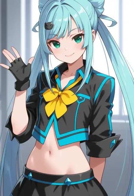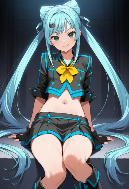 黑色衬衫,微笑,有领衬衫,无指手套,黑色手套,黄色领结,露脐,肚脐,裙子,黑色裙子,黑色长靴,