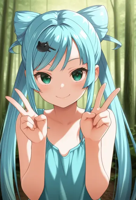 Sagara Momoka,绿色眼睛,蓝色头发,长发,非常长的头发,双马尾,发饰,