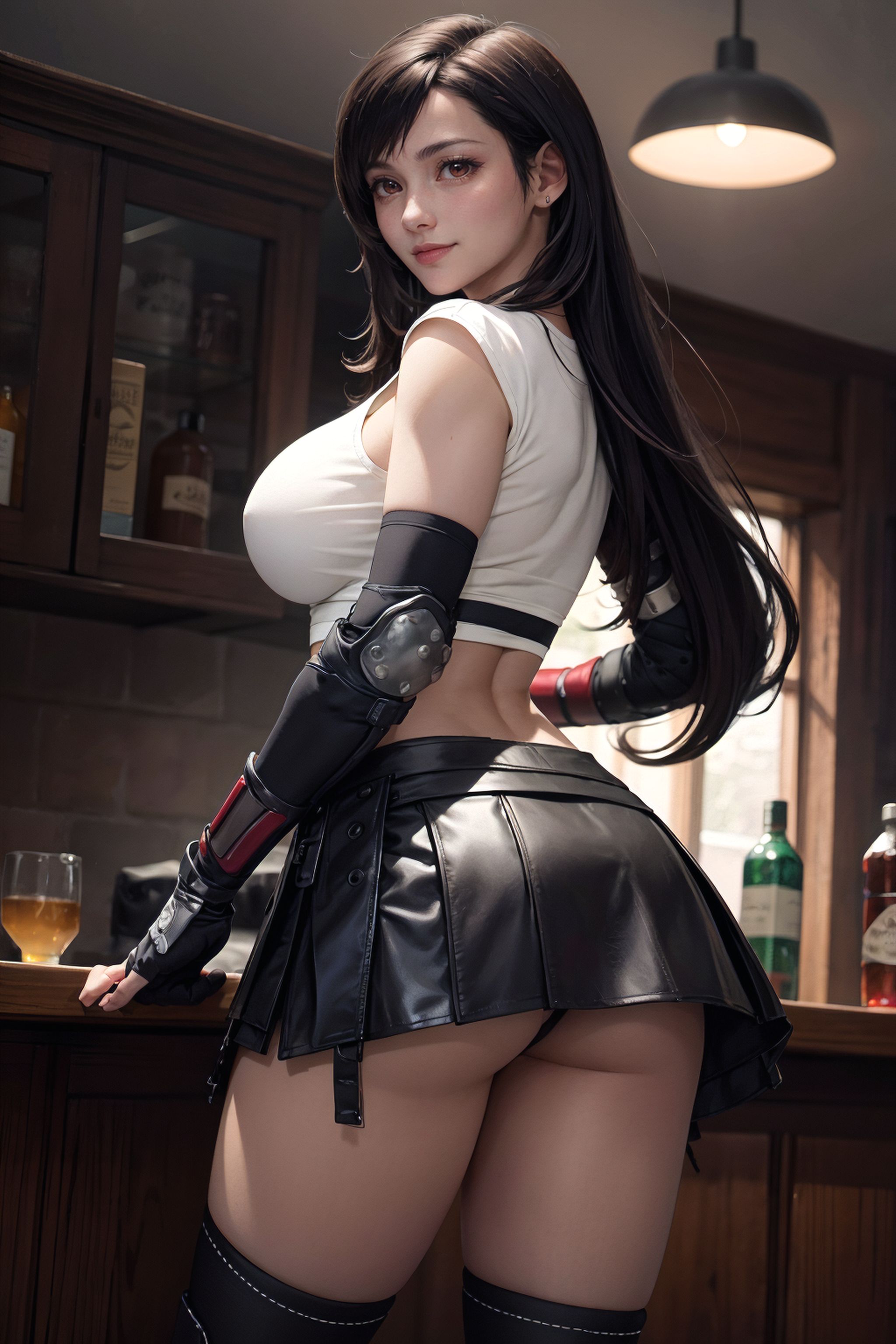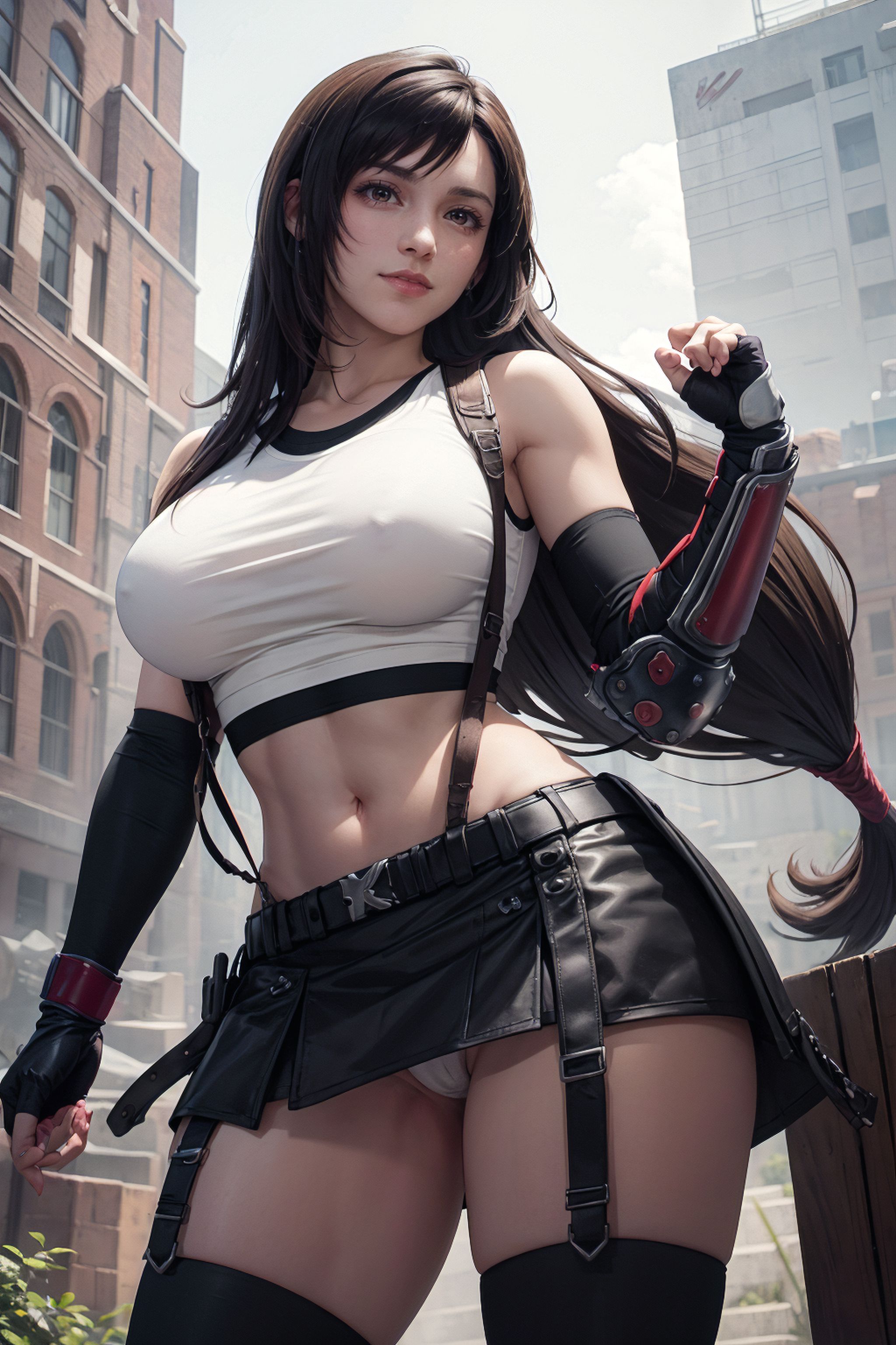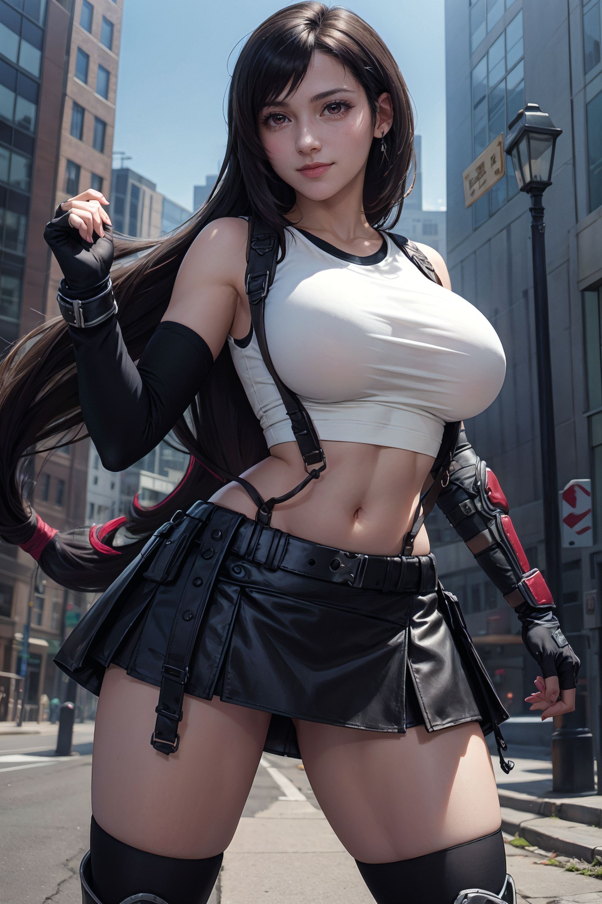 Tifa, 1girl, black hair, very long hair, (red eyes, white crop top, black skirt, black legwear, boots, arm guards, elbow gloves, fingerless gloves),long eyelashes, sagging breasts ,heavy engorged breasts, looking at viewer