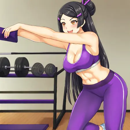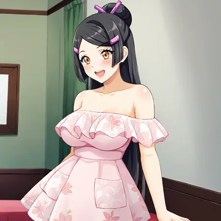 트리거: RikaCollegeLife, 1girl, solo, 큰 가슴, 어깨 드러냄, 머리 장식, 젖가슴 노출, 노랑색 바지, 보라색 목걸이, 배꼽, 검은 머리, 머리핀, 허리 노출, 옷 노출, 어깨뼈, 분리된 소매, 주황색 눈, 흰색 셔츠, 갈라진 앞머리, �ank top, 허벅지 간격, 크롭탑, 꼬리머리, 머리 땋음, 긴 소매