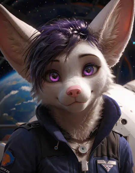 // Illustrious: adra_tiddles, furry, fennec fox, mammal, furry female, white and black tail, 1girl, solo, short hair, clothed, hair on side, thighhighs, pink nose, fabric clothes, striped stockings, topwear, jacket