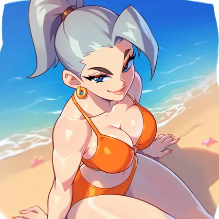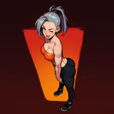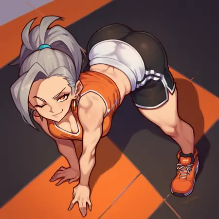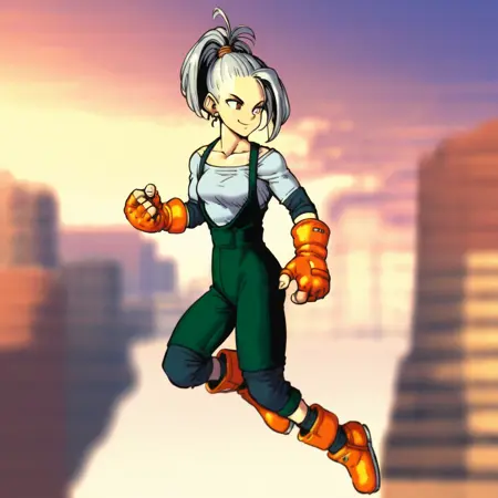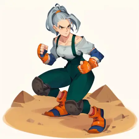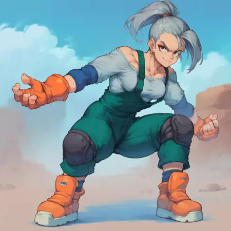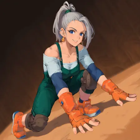 デフォルトの服装: デフォルトの服装、手袋、ひざパッド、指なし手袋、オレンジ色の靴、ポニーテール、オレンジ色の手袋、濃い緑色のオーバーオール、グレーのシャツ、肘パッド、青い肘パッド