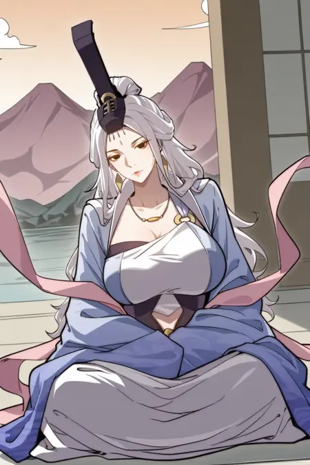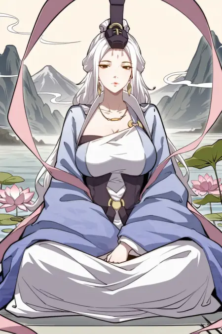 Xixuan, black eyes, mole under eyes, white hair, long hair, hair ornament, earrings, forehead mark, necklace