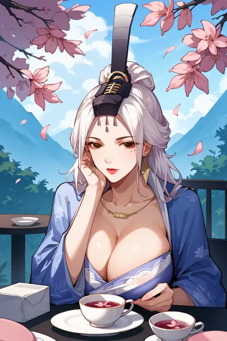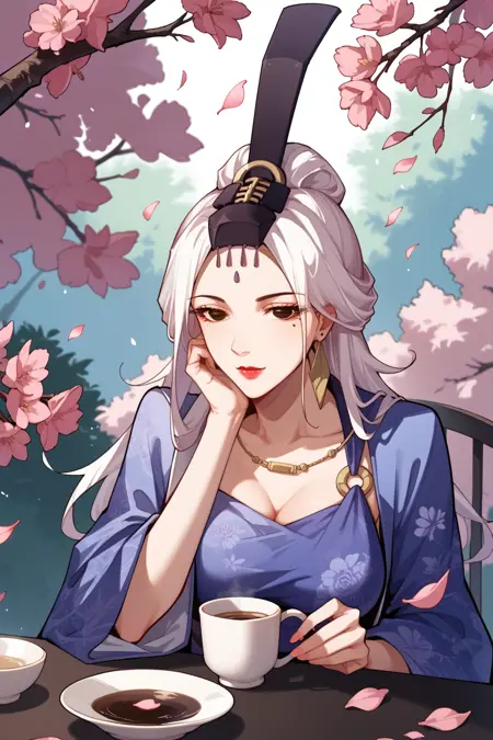 Xixuan, white hair, hair ornament, black eyes, mole under eye, jewelry, long sleeves, wide sleeves