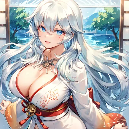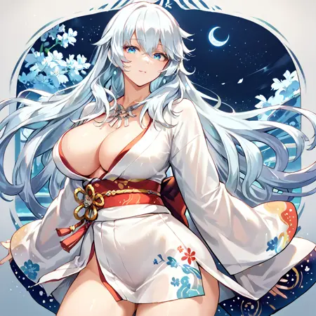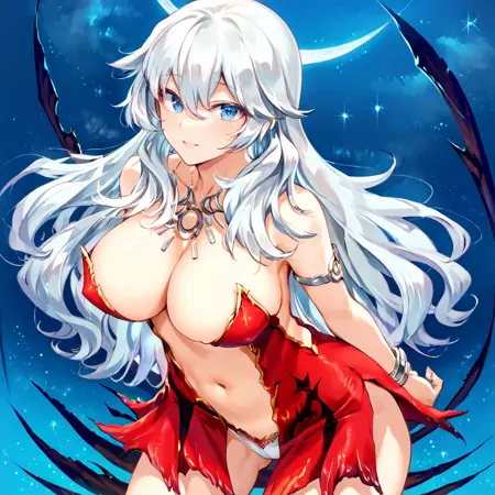 artemis, white hair, long hair, blue eyes, breasts, large breasts,