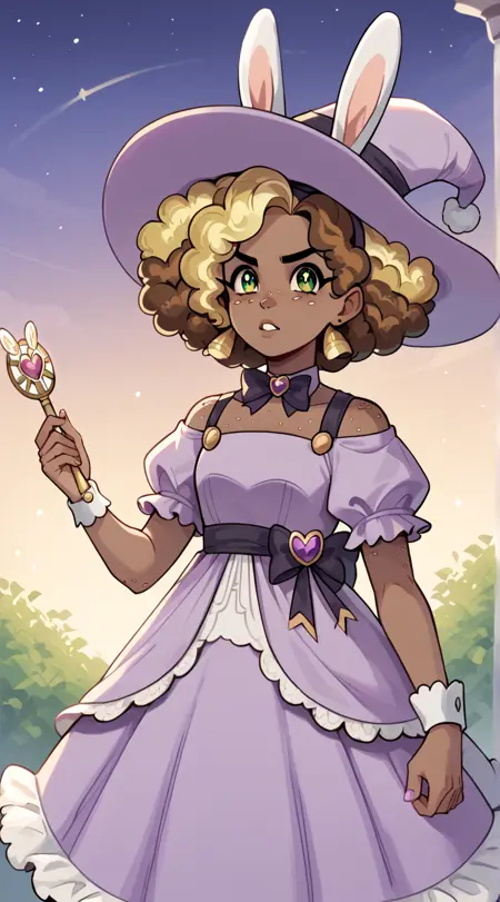 Bunny Knight Lorelai, puffy sleaves, witch hat, purple dress, wand