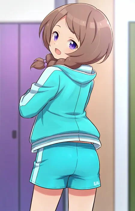 akane, akanejacket, brown hair, purple eyes, aqua jacket, aqua shorts