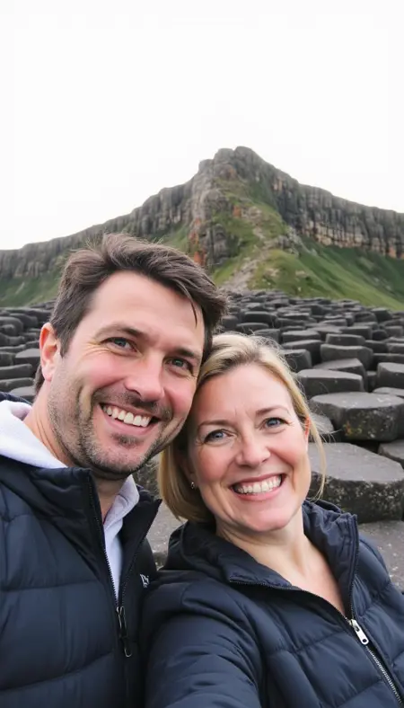 "g14nt, 관광객들이 거인의 보도에서 자동 셀카를 찍는 모습, 독특한 암석 구조, 풍경 사진"