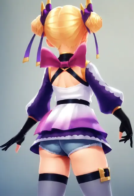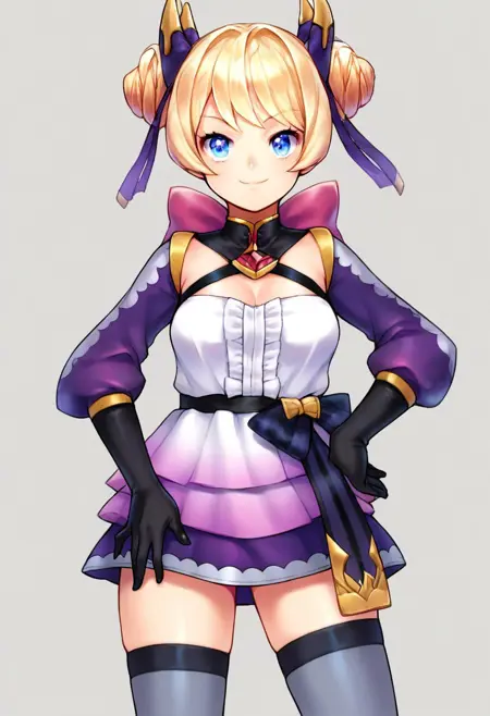 | 训练词汇 | EsnaChro, blue eyes, blonde hair, swept bangs, roll buns hair, twin buns, hair ornament, horn shaped ribbon ornament, ribbon tip ornament, two-tone ribbons,已复制! original outfit, frilled top, neck red jewel, cleavage cutout, detached sleeves, puffy sleeves, thumbless gloves, thumb out gloves, black gloves, two-tone sleeves, ribbon belt, two-tone purple skirt, gradient dress, grey thighhighs, two-tone footwear, mary janes flat shoes, black footwear, golden plate ends, golden plate on footwear tip, purple long bow behind,已复制! |