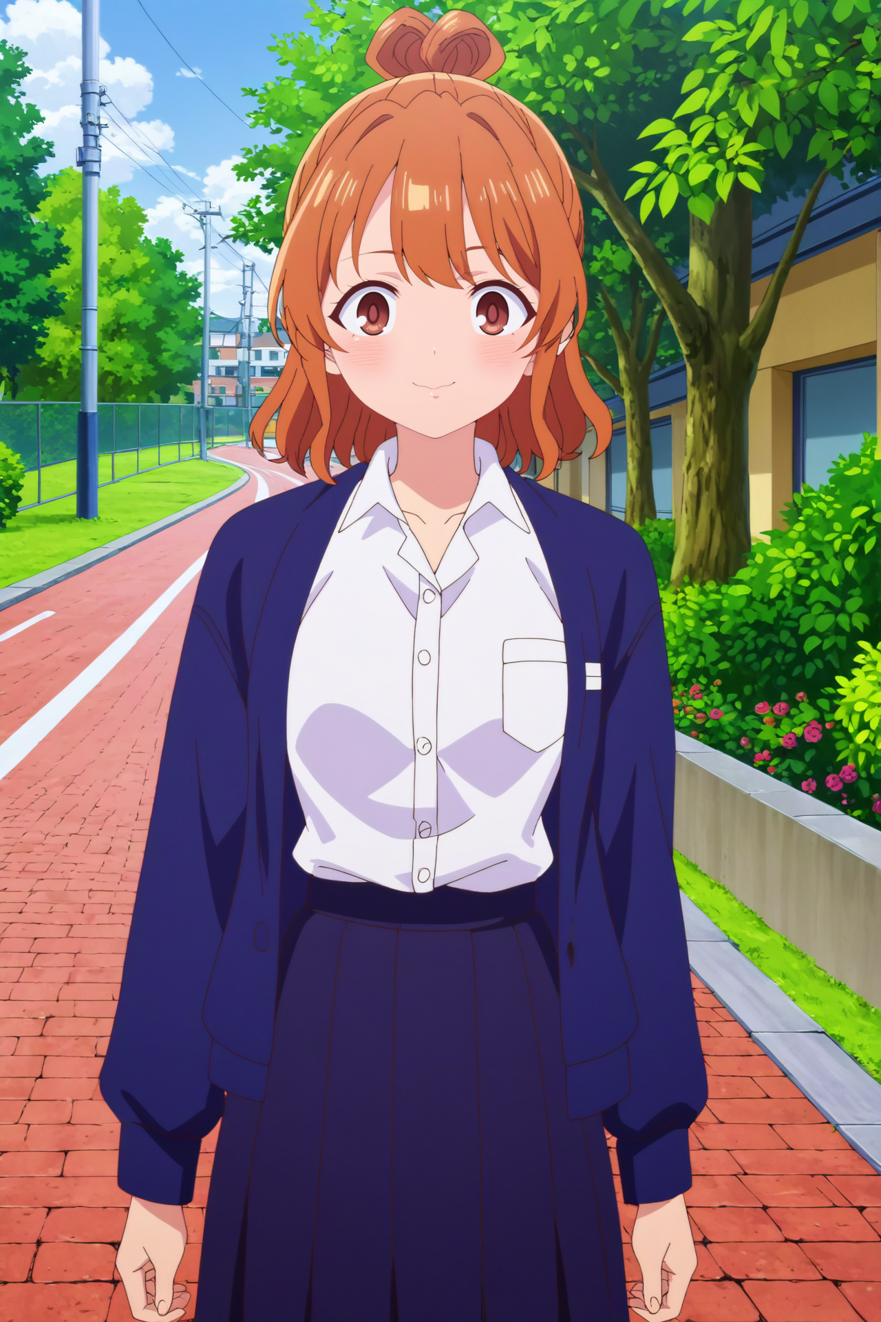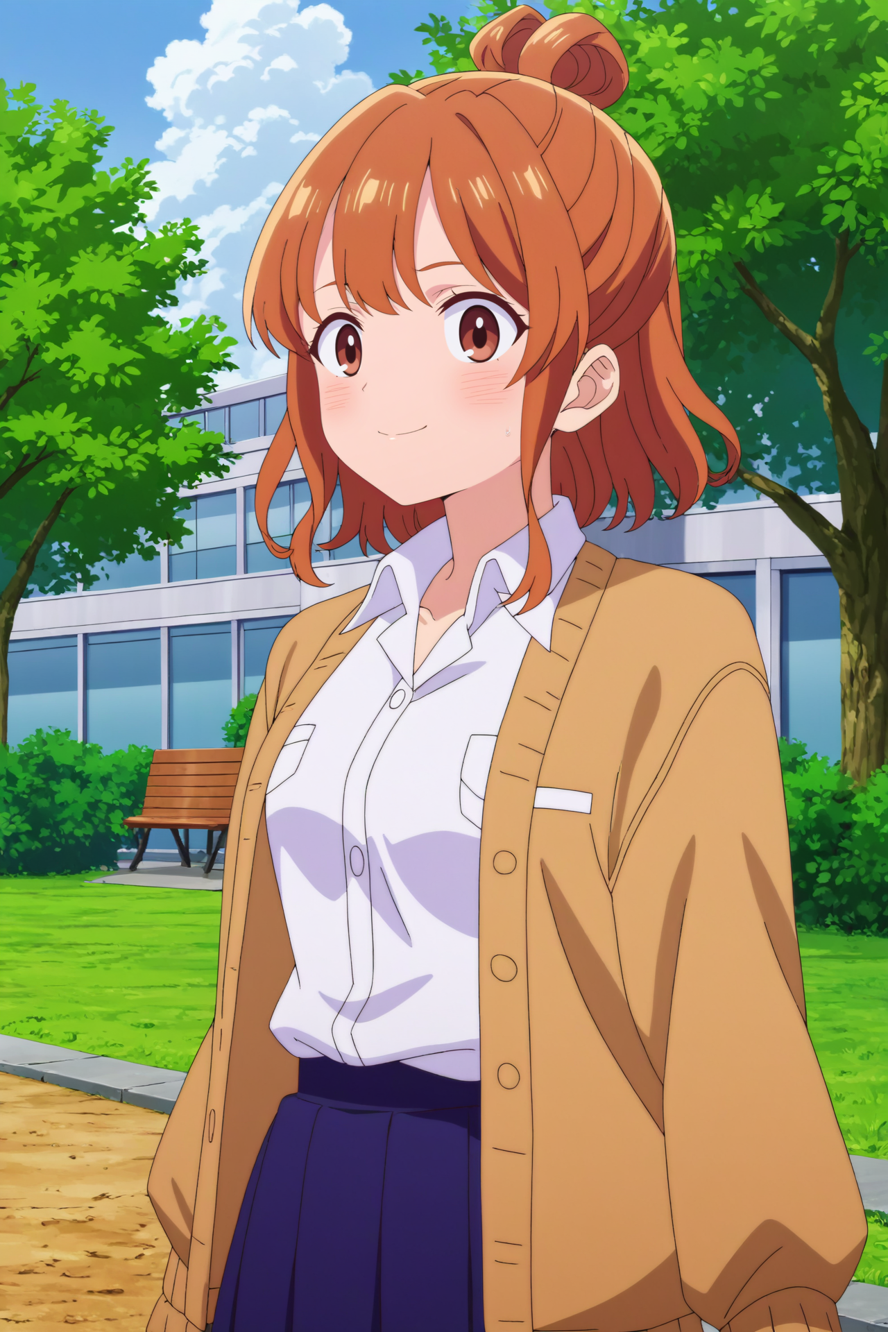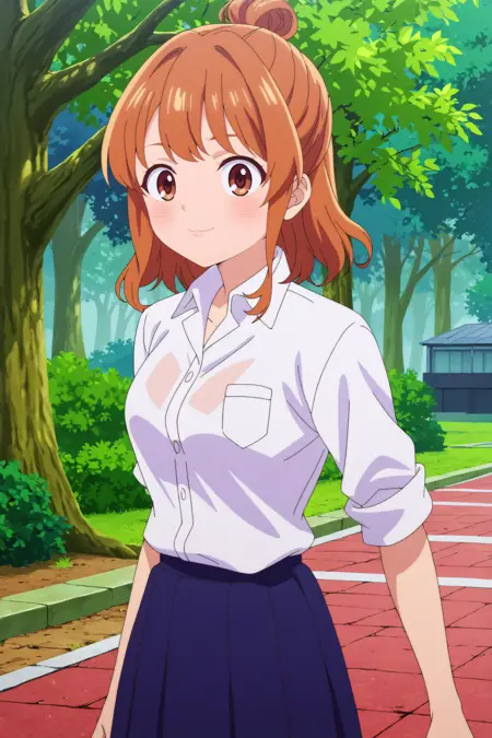 触发词:moeko sekine,1girl,solo,brown eyes,brown hair,looking_at_viewer,blush,hair bun,single hair bun,skirt,smile,collared shirt,white shirt,breasts,school uniform
