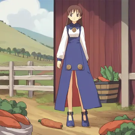 このキャラクターのタグ付けは大変だった。彼女の衣装は比較的複雑で、そのほとんどに正確なタグが存在しなかった(私は記事のコミュニティの助けをたくさん借りて、何とかタグを特定した)。驚いたことに、エポック2ではほぼモデル通りだったが、二重スカートの部分だけが問題だった。この要素はエポック4まで学習され始めたが、完全には習得されず、エポック6で安定した。使用した画像は、セッティ12枚、公式アート8枚、ファンアート2枚(合計22枚)で、シャッフルキャプションのタグ付けを忘れてしまった。彼女がジャガイモの畑を収穫している画像を含めてしまったため、ジャガイモが奇妙なハイブリッド野菜になってしまうのではないかと心配したが、確認したところ、PDXLはそもそもジャガイモが何かを理解していないようだった。サンプル画像での手の問題は、「視聴者に向かって手を伸ばしている」というタグの影響であり、LoRAの問題ではないと考えられる。