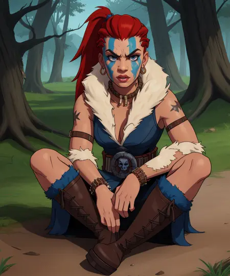hellion, 红色马尾辫,蓝色面部纹身,蓝色身体纹身,蓝色眼睛