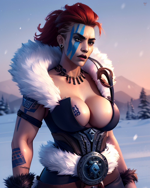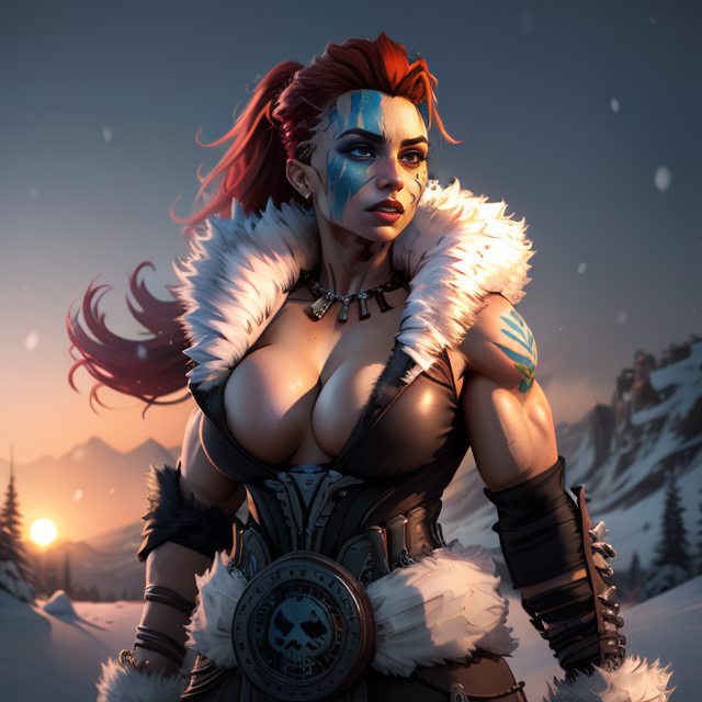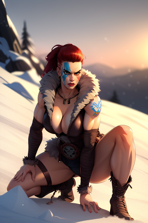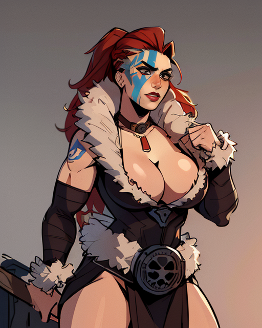 가슴 노출, 갈색 부족 복장, 털 장식, 털 턱받이, 벨트, 부츠,