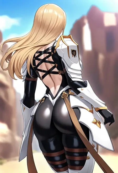 Backview prompts : armor, ass, back, back cutout, bodysuit, pauldrons, shoulder armor, skin tight, from behind, median furrow