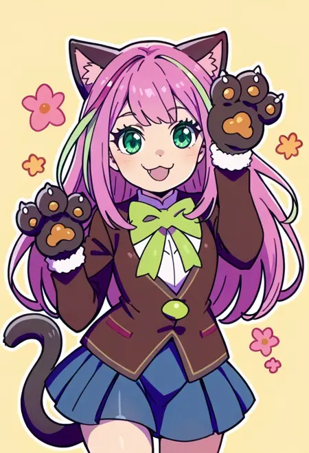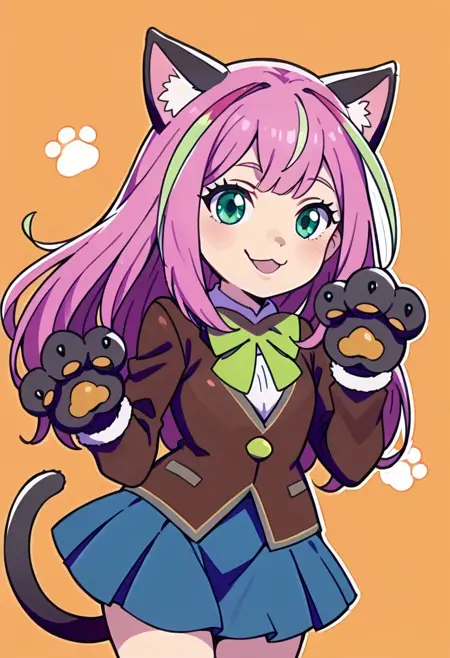 大人:ピンクの髪、長い髪、複数色の髪、動物の耳、ジャケット、プリーツスカート、猫の耳、青いスカート、ストライプの髪、猫の尾、手袋(猫の肉球)