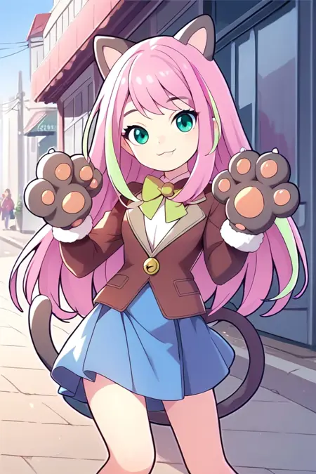 成人:粉发,长发,多色发,动物耳朵,夹克,百褶裙,猫耳,蓝裙,挑染发,猫尾,爪套