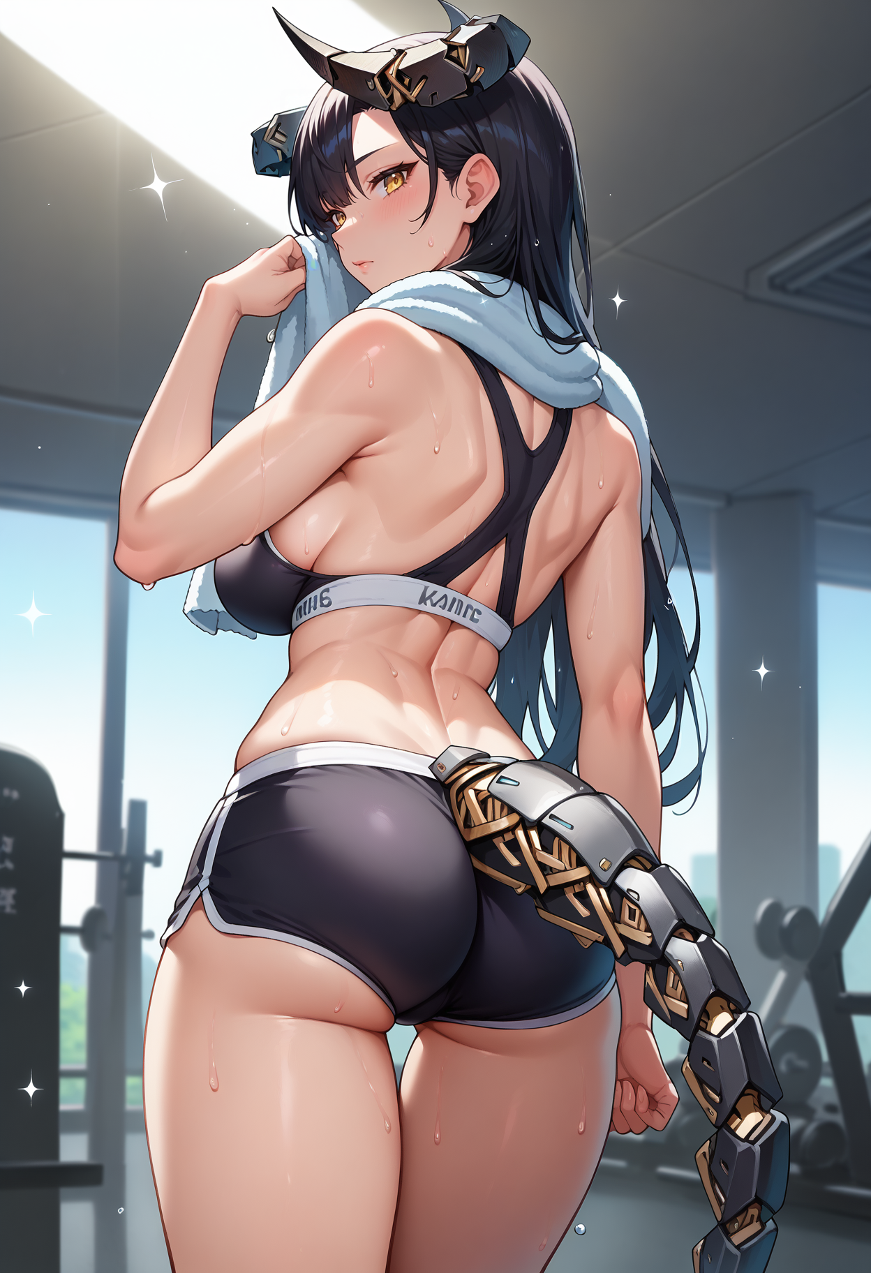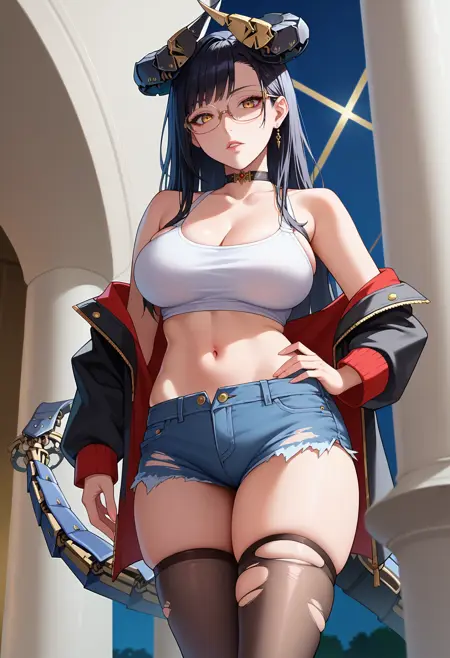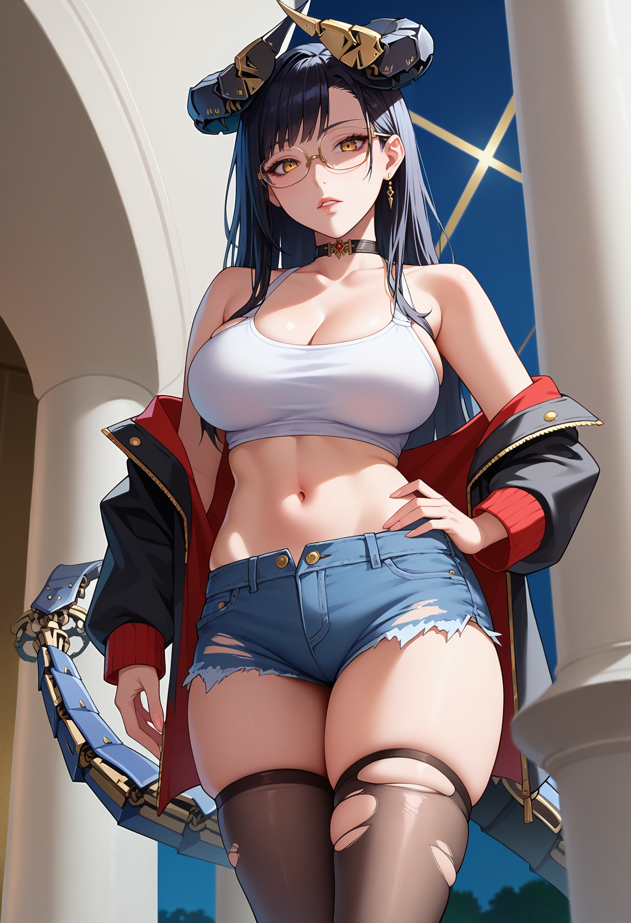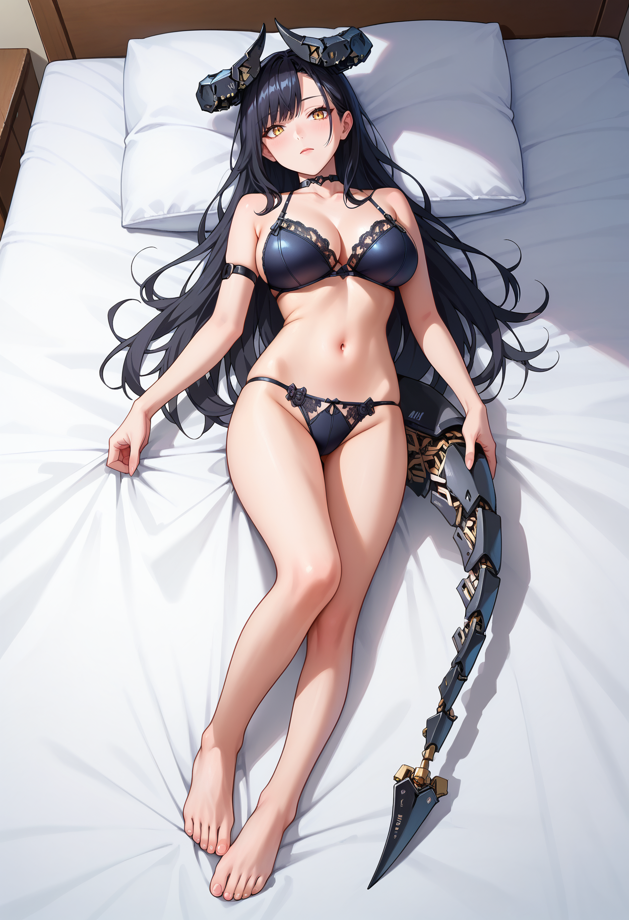 KJOobsidian, black hair, yellow eyes, long hair, horns, mechanical tail, asymmetrical bangs,