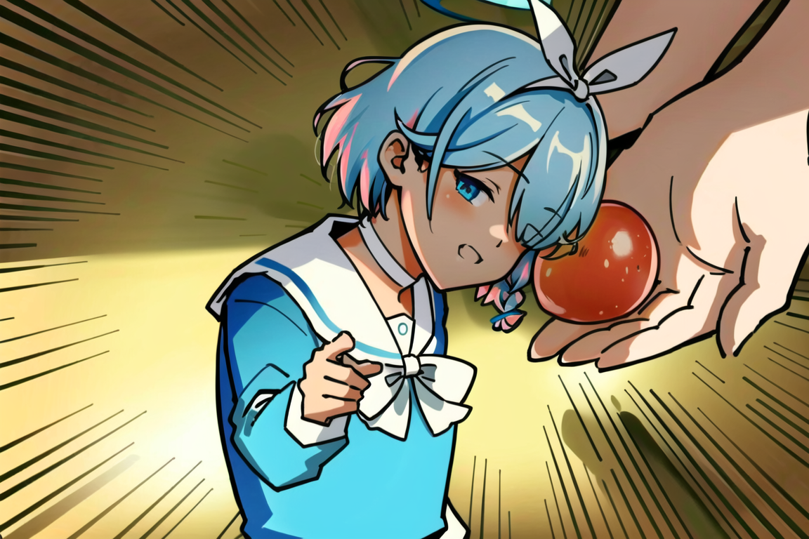 推奨プロンプト: 持っている、観客を見つめる、食べ物、果物、パロディ、強調線、果物を持っている