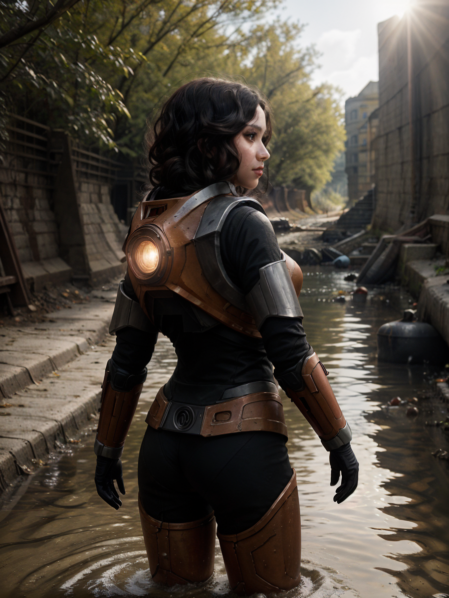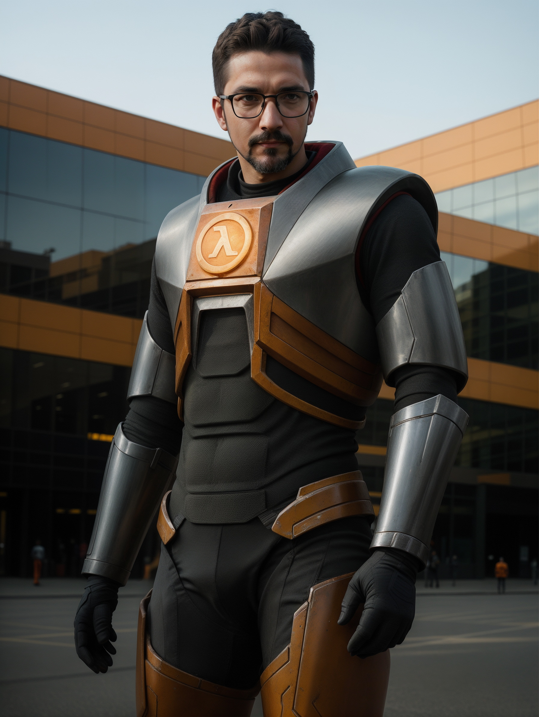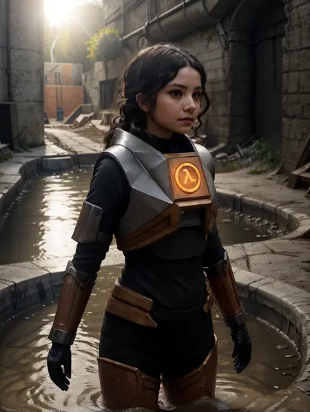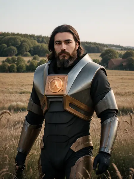 示例提示词:一名身着HEV套装mk5、站在草地上的男子 / 一名戴眼镜、留山羊胡、身着HEV套装mk5、站在建筑前的男子 / 一名身着HEV套装mk4、站在走廊中的女子。
