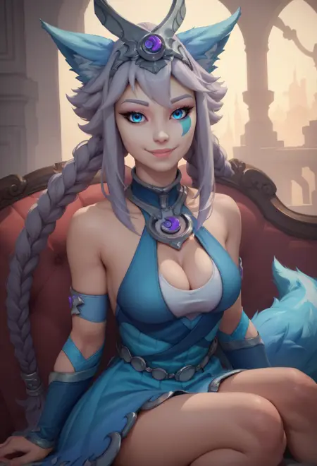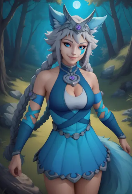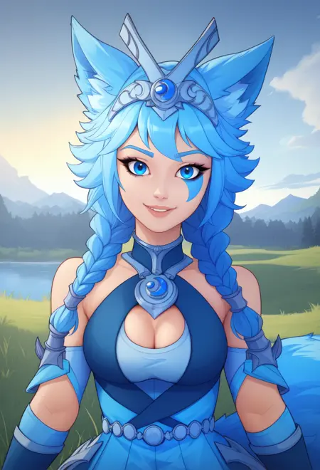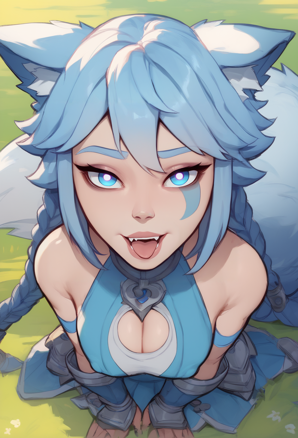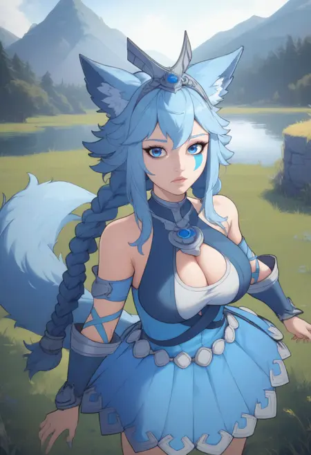 Io, blue eyes, wolf ears, twin braids, long hair, light blue or light purple hair, or grey hair,