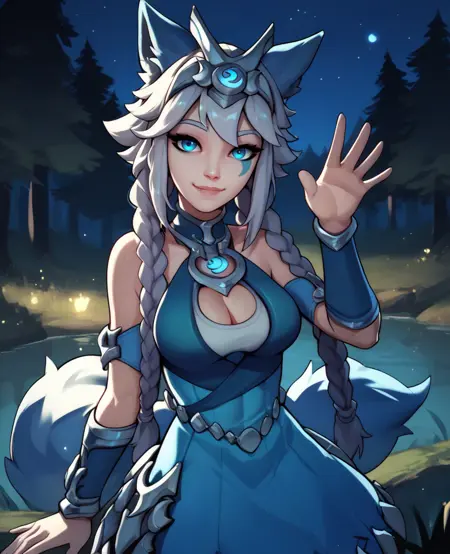 Io, blue eyes, wolf ears, twin braids, long hair, light blue or light purple hair, or grey hair,