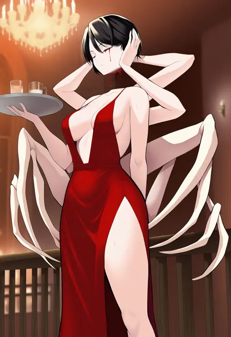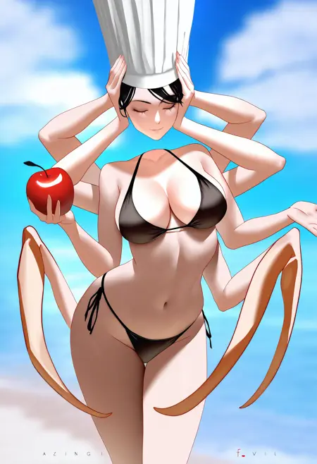 トリガー+外見: f4llingd3vil, 追加の腕, 足虫の肢, 目からの血, 鼻血, 口からの血, 頭を抱える, 切り離された頭, 身体から分離した頭, 短い髪, 黒髪, シェフ帽, 目を閉じた