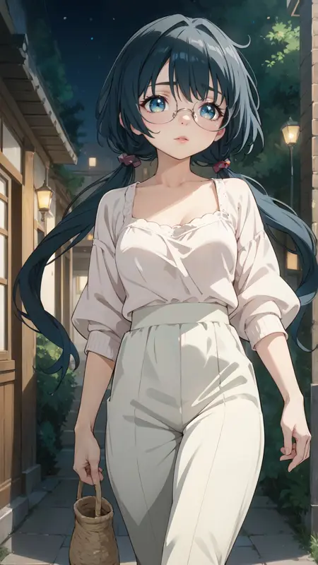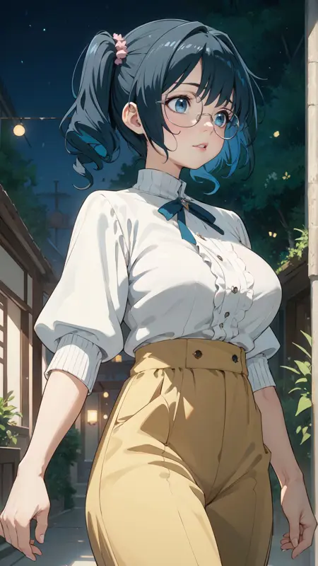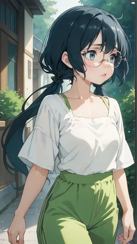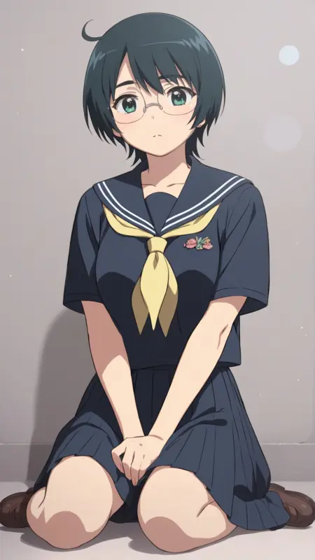 推荐提示词:"miharu_mikuni, 一位动漫女孩, 1girl, 单人, 短发, 简单背景, 黑发, 白色背景, 校服, 眼镜, serafuku"