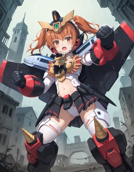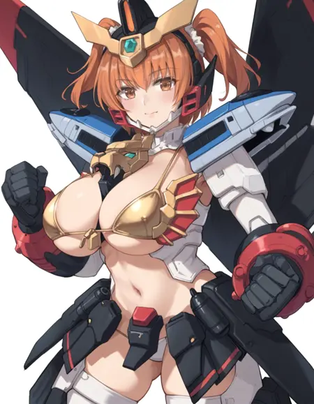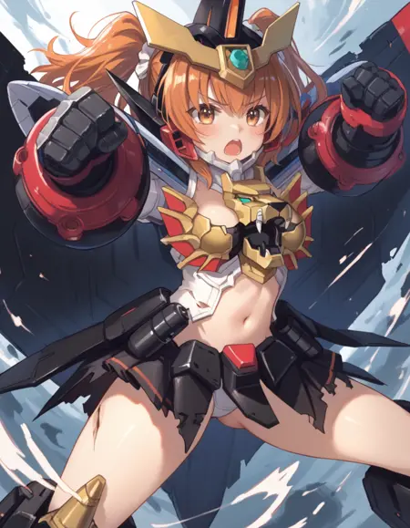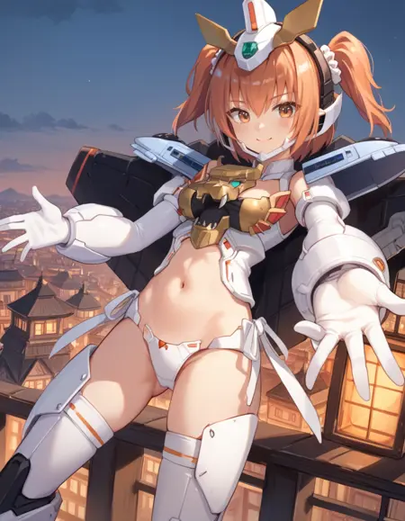 태그(옷 3): 흰색 갑옷 허벅지 부츠, 허리, 흰색 허벅지 양말, 흰색 갑옷 장갑, 흰색 헬멧, 주먹 불끈 쥔 손, 흰색 가슴 갑옷, 흰색 속옷, 머리끈,